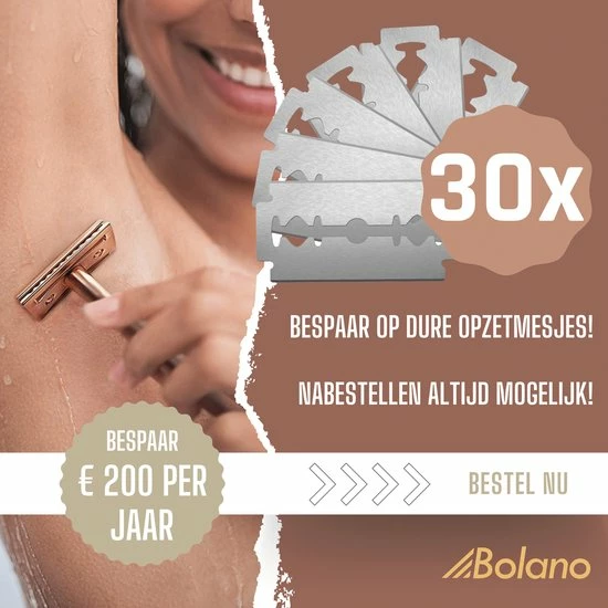 Alle Bolano safety razors zijn voorzien van een luxe verpakking met maar liefst 30 RVS double edge scheermesjes. 30! Daar ben je het komende jaar zeker zoet mee EN daar bespaar je op jaarbasis enorm veel geld mee ten opzichte van de opzetmesjes van duurdere merken.