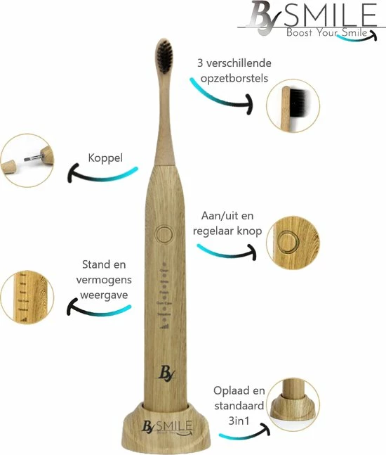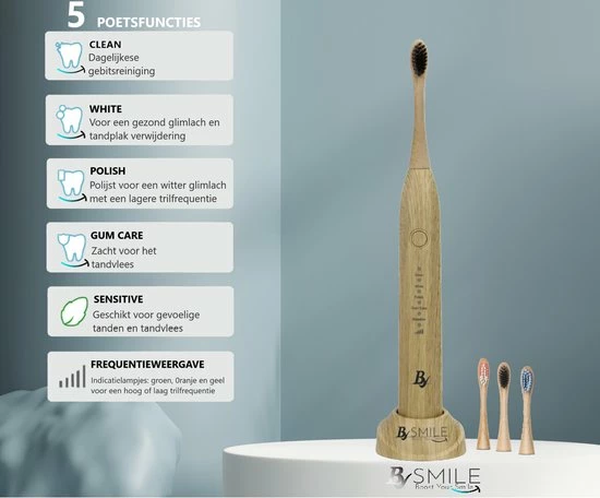 De BySMILE® elektrische tandenborstel wordt geleverd met 3 verschillende bamboe opzetborstels. Elk heeft een uniek kenmerk en zorgt voor een ander effect van jouw tanden.
