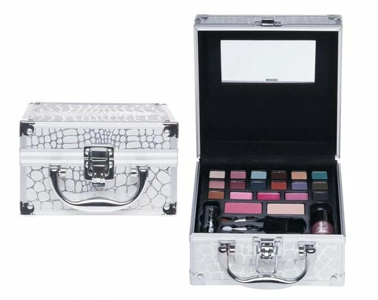 Inhoud: 1 x spiegel, 14 x oogschaduw, 3 x lip shimmer, 1 x blusher, 1 x gezichtspoeder, 1 x lipstick, 1 x nagellak, 1 x blusher kwast, 1 x applicator en 1 x lip kwastje.
