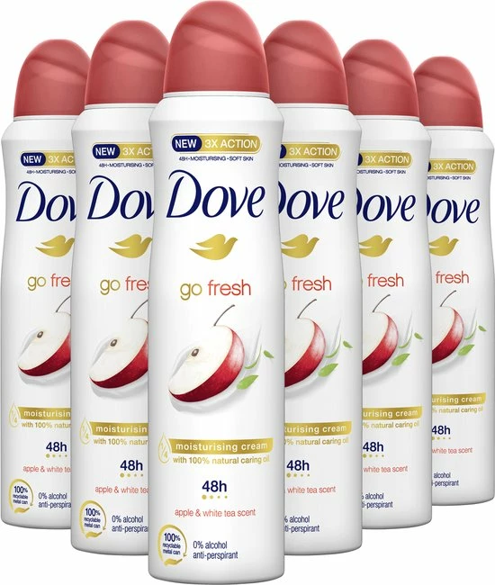 Dove Go Fresh Apple & White Tea Anti-Transpirant Deodorant Spray met drievoudige werking beschermt tegen zweet, hydrateert en maakt de huid zachter en gladder.