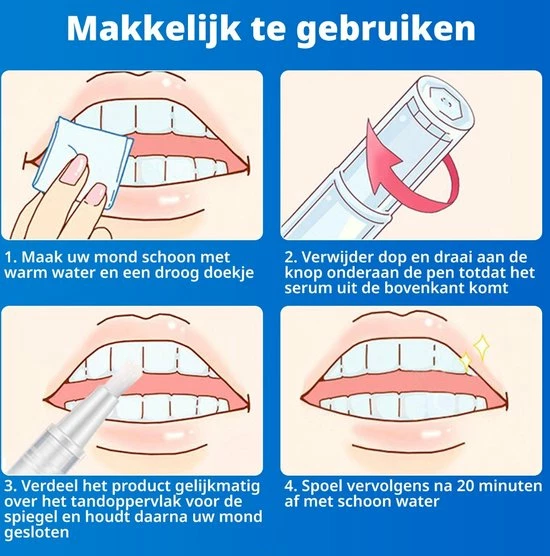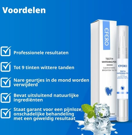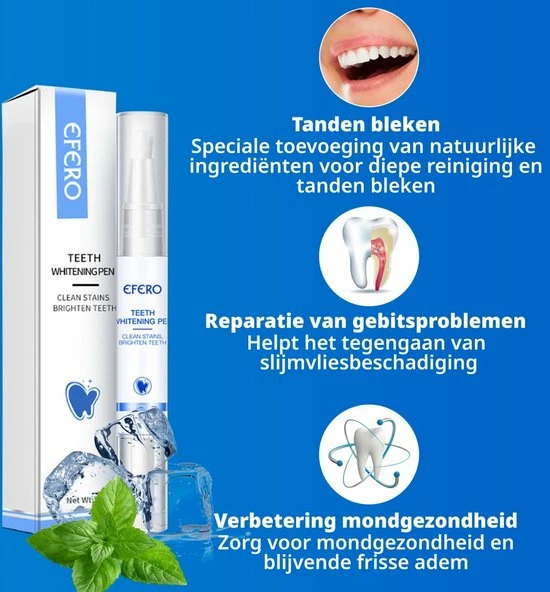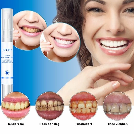 Het is nu mogelijk met de Efero Tanden Bleekpen. Met mondhygiëne serum verwijdert u tandplak, versterkt u het tandglazuur en maakt u vlekken schoon in een handomdraai. Eindelijk weg met de bruine vlekken op uw tanden door het roken en drinken van koffie, laat u stralende lach maar zien! Het product is meerdere keren per week te gebruiken, totdat het gewenste resultaat zichtbaar is.