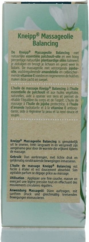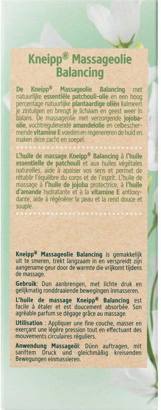 De ontspannende Kneipp massageolie Balancing – Patchouli bevat natuurlijke essentiële patchouli-olie voor een heerlijk rustig gevoel. Beleef de warme, zachte, zoete en licht kruidige geur en ervaar dat lichaam en geest weer in balans komen. De speciale formule is zacht voor de huid en maakt de huid soepel. De massageolie is gemakkelijk uit te smeren, trekt langzaam in en verspreidt zijn aangename geur door de warmte die vrijkomt tijdens de massage.