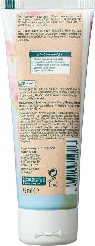 De Kneipp® softening handcrème Favourite Time met verzorgende plantaardige formule, kersenbloesem extract en waardevolle natuurlijke oliën hydrateert en voedt de handen intensief.