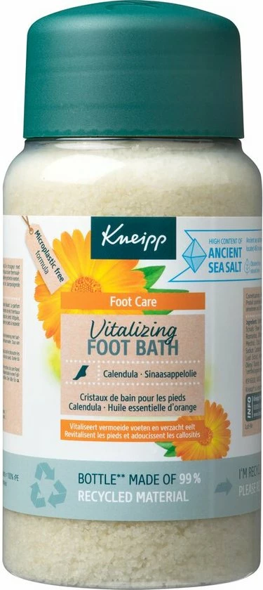 Verwen jezelf en je voeten met een ontspannend voetbad na een zware dag! De citrusgeur met natuurlijke, etherische sinaasappelolie revitaliseert de zintuigen en verfrist. Met natuurzuiver thermaalzout reinigen de Kneipp® voetbadkristallen Vitalizing – Calendula Sinaasappelolie op milde wijze de vermoeide en gestreste voeten. Ze neutraliseren nare geuren en verzachten eelt. De optimale voorbereiding voor de daaropvolgende voetverzorging!