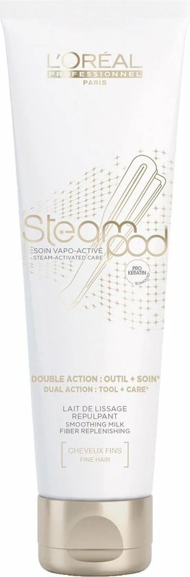 L’OrΓ©al Steampod Double Action Milk – Fine is voor fijn haar. De milk dient gebruikt te worden in combinatie met de L’OrΓ©al Steampod 3.0. Deze milk geeft het haar bescherming en extra voeding. Daarnaast zorgt deze milk ervoor dat het haar tot wel drie dagen pluisvrij is en zijdezacht aanvoelt.