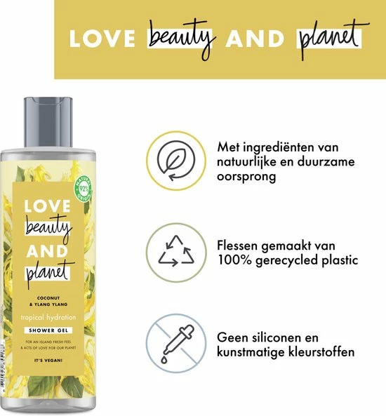 Bij Love Beauty and Planet geloven ze in effectieve natuurlijke verzorgingsproducten, ofwel in beauty zonder concessies. Vanaf nu kun je met elke douche een klein verschil maken voor de wereld. Zo zijn al de flessen gemaakt van 100% gerecycled plastic. Good for you & Good for the planet. Baad je huid in tropische geuren met onze Tropical Hydration showergel. De verzachtende showergel is gemaakt met ingrediΓ«nten van natuurlijke en duurzame oorsprong. Verwen je huid met een ochtendfris gevoel met de geur van Ylang Ylang, die van etnische herkomst is van het eiland MohΓ©li in de Comoren.