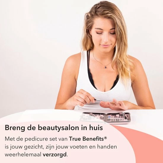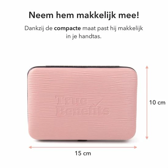 Vaak zie je dat wanneer je jouw set mee moet nemen op reis, het in een hele grote en niet compacte kist moet. Dit is super onhandig! Gelukkig heeft deze manicure en pedicure set van TrueBenefits een hele compacte reistas van 15.5 bij 10.5 cm! Dat is nou echt een true benefit!