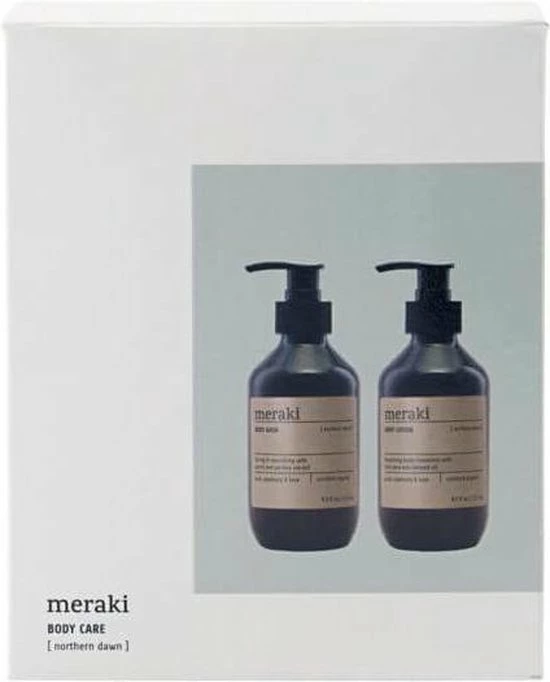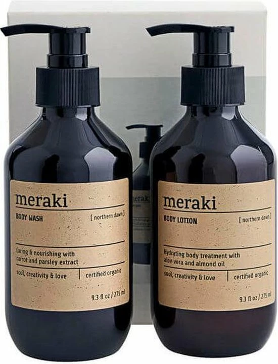 Het geven van een cadeau brengt vreugde voor zowel de gever als de ontvanger, wat de gelegenheid ook is. Verras een geliefde met deze mooi geschenkset van Meraki. De set bestaat uit een bodywash en een bodylotion met de populaire Northern Dawn geur. Beide zijn gecertificeerd biologisch. De bodywash voedt en hydrateert je huid met organische extracten van wortel en peterselie. Maak je verzorgingsroutine af met de bodylotion die je huid verzacht en hydrateert met amandelolie en cacaoboter. Northern Dawn is een verfrissende geur van frisse sinaasappels, cederhout en zoete balsamico.