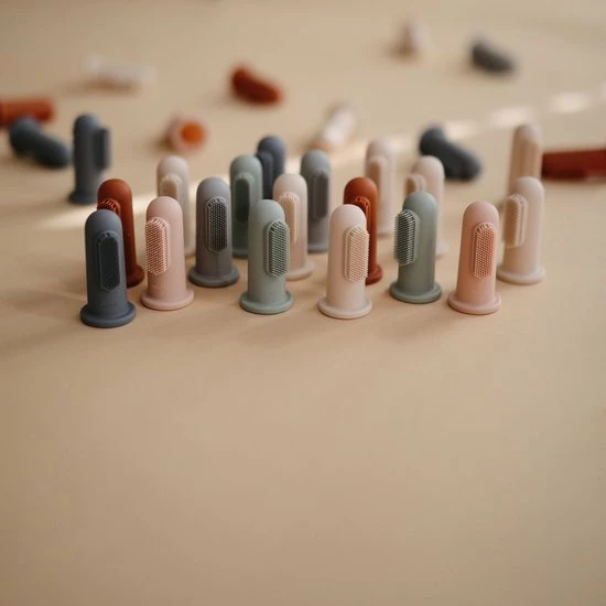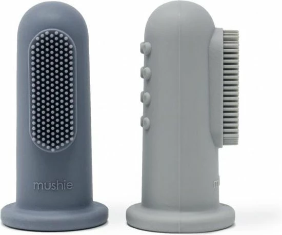 Deze fijne vingertandenborstels van Mushie zijn ideaal voor het poetsen van de eerste tandjes.