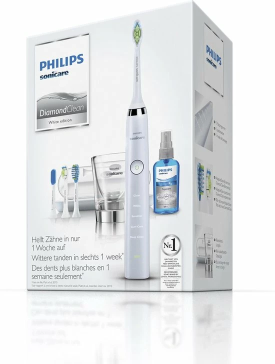 Verwijder tot wel 10 keer meer tandplak dan met een gewone tandenborstel met de Philips Sonicare DiamondClean HX9398/20 inclusief luxe oplaadglas en TongCare. Ook maakt hij je tanden meer dan dubbel zo wit en verbetert de gezondheid van je tandvlees in slechts twee weken. De DiamondClean is voorzien van 5 poetsstanden waaronder de DeepClean-modus voor uitzonderlijke reiniging op moeilijk bereikbare plekken. De DiamondClean is 3 weken te gebruiken zonder op te laden. Deze DiamondClean wordt geleverd met 3 opzetborstels, en is op te laden middels het oplaadresietui en het unieke oplaadglas. Kortom, de ideale tandenborstel voor de optimale reiniging.
