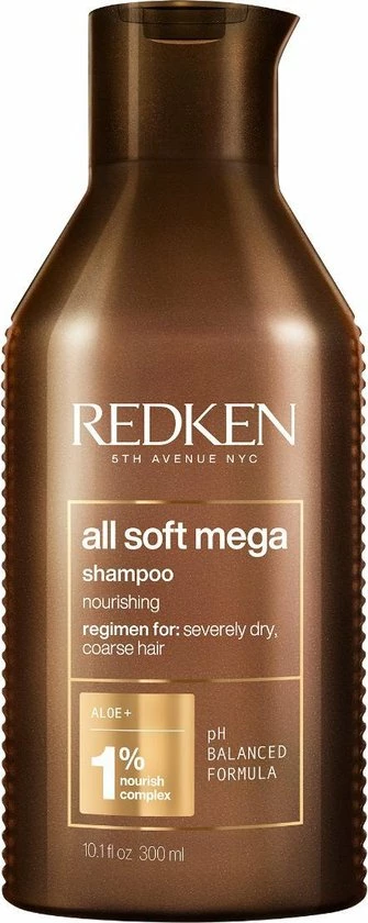 Redken All Soft Mega Shampoo hydrateert en verzacht droog haar. De shampoo is ideaal voor alle types droog haar, zowel krulllen, steil haar als slag. Wassen met deze shampoo voorkomt vochtverlies bij droog haar. Door een mix van Sacha inchi-extract, AloΓΒ« vera-gel en cactusextract wordt het haar van de kern tot in de punten behandeld. Droog en stug haar wordt gehydrateerd en zal er weer zacht en gezond uitzien.