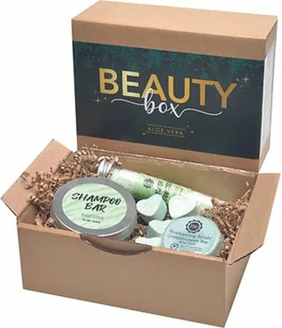 Beautybox Aloe Vera is een mooie kartonnen doos gevuld met een aluminium opbergblik met daarin een shampoo bar,