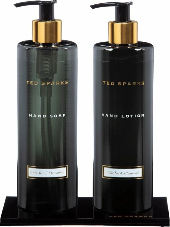Een stijlvol duo en een prachtig cadeau: de Ted Sparks hand care Giftset White Tea & Chamomile. De hand soap en hand lotion geven je handen wat ze nodig hebben: luxueuze verzorging en voeding met de geur van White Tea & Chamomile. De hand soap is verrijkt met glycerine, reinigt de handen op milde wijze en hydrateert de huid. De rijke formule helpt om de zachtheid van de huid te herstellen. De hand lotion heeft een verrijkte formule met vitamine E die helpt je huid te voeden en te verzachten. De geur heeft een basis van kamille voor een bloemig genot waarmee je een luxe verwenmoment voor jezelf creΓ«ert. De verse aroma van gezoete witte thee zorgt samen met een vleugje AloΓ« Vera voor een aangename frisheid en een schoon gevoel.