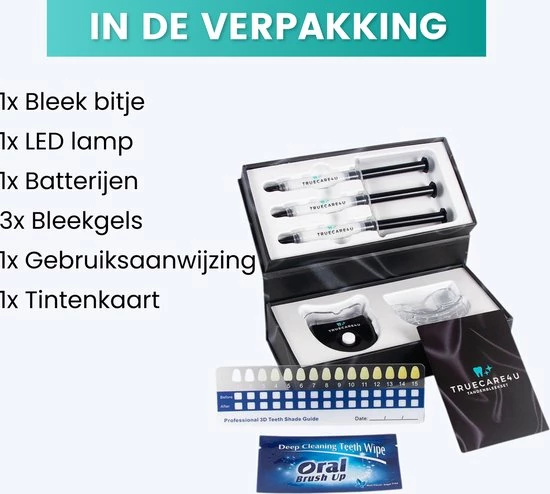 In de verpakking van deze tandenbleekset zitten 3 gels, het bleekbitje, LED lampje inclusief batterij, een gebruiksaanwijzing en een tintenkaart waarmee je het verschilt kunt bijhouden!