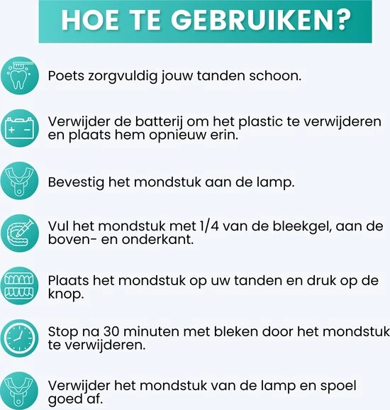 - Stop na 30 minuten met bleken – Verwijder na 30 minuten het mondstuk.