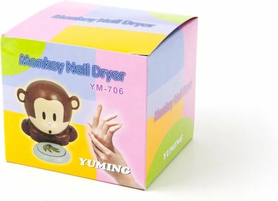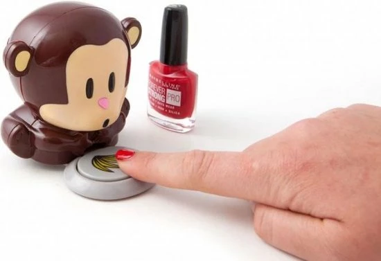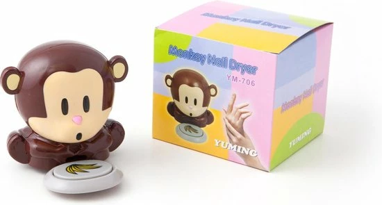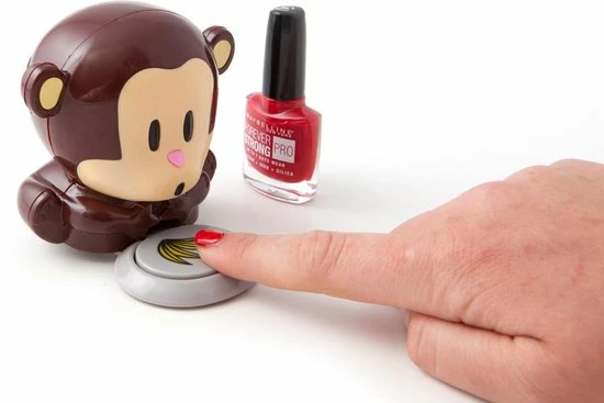 De Nageldroger Aapje is een handig en schattig aapje dat je helpt je gelakte nagels te drogen. In plaats van je nagels zelf droog te blazen of met je handen te wapperen, druk je op de afbeelding met bananen en het Aapje blaast je nagels droog! Plaats 2 AAA 1.5V batterijen (niet meegeleverd) en het Nageldroger Aapje is je beste vriend om je gelakte nagels droog te krijgen!